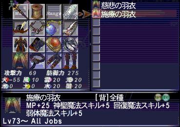 施療の羽衣[背]MP+25 神聖魔法スキル+5 回復魔法スキル+5 弱体魔法スキル+5 Lv73~ All Jobs(ER